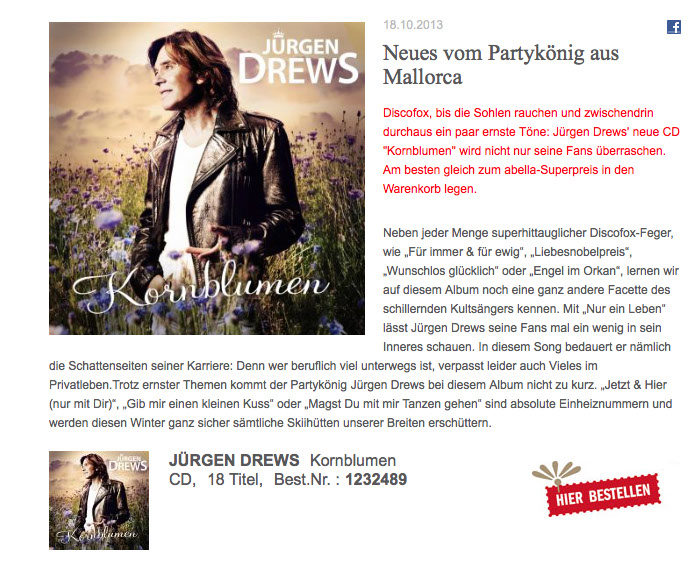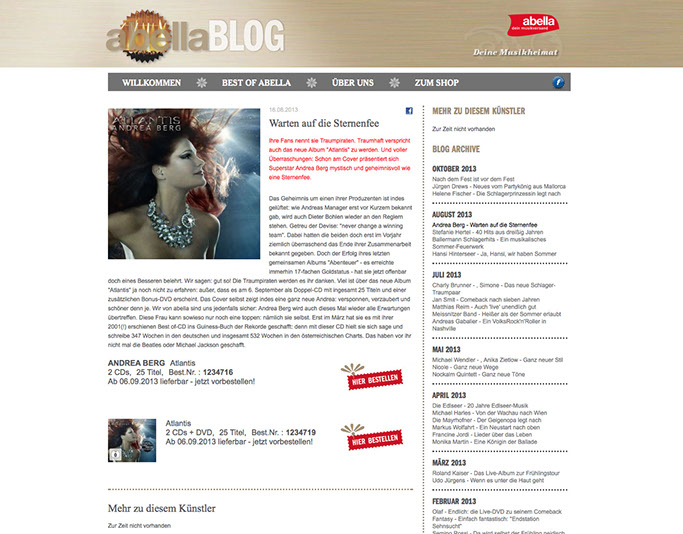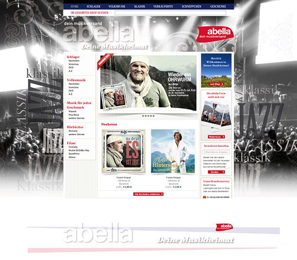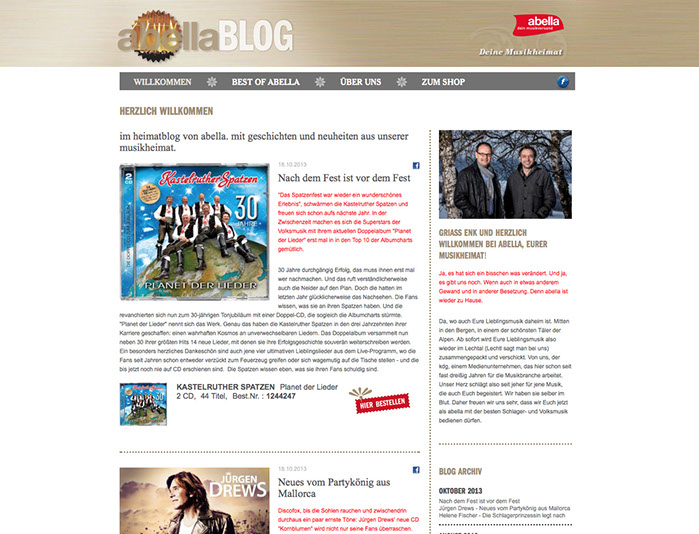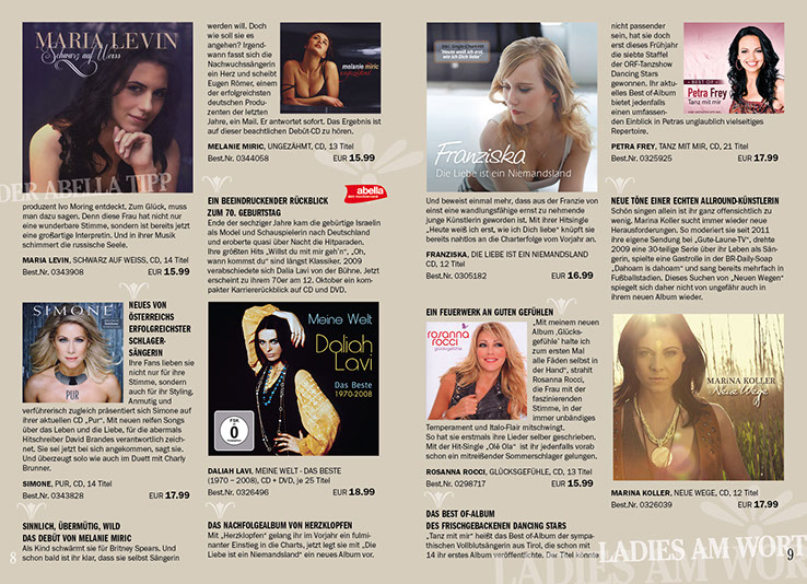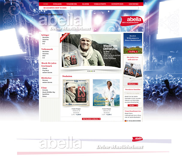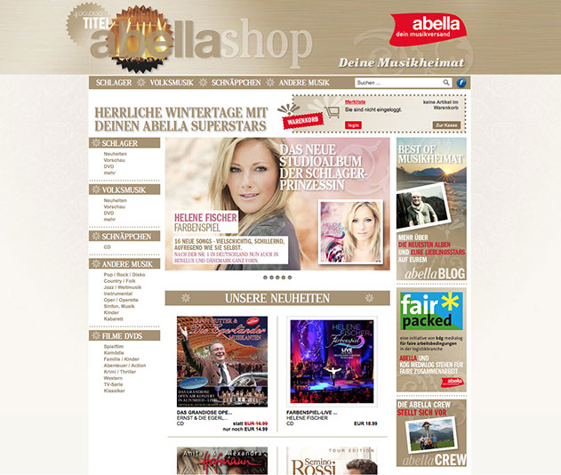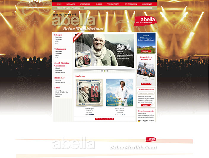 Der Name klingt noch heimatlich in den Ohren. Das freut uns. Ja, es gibt ihn wieder. Runderneuert als Musikheimat für alle Freunde der Schlager und Volksmusik. Mit über 400.000 lieferbaren Titeln zu fairen Preisen. Die Marke abella wurde von Koch CD komplett neugestaltet. Logo, Corporate Design, Bestellkataloge, Anzeigen, Webshop, abella Blog.