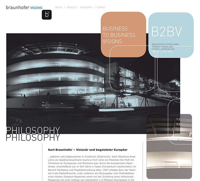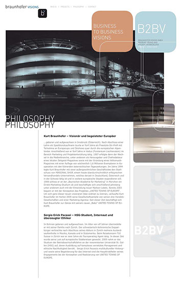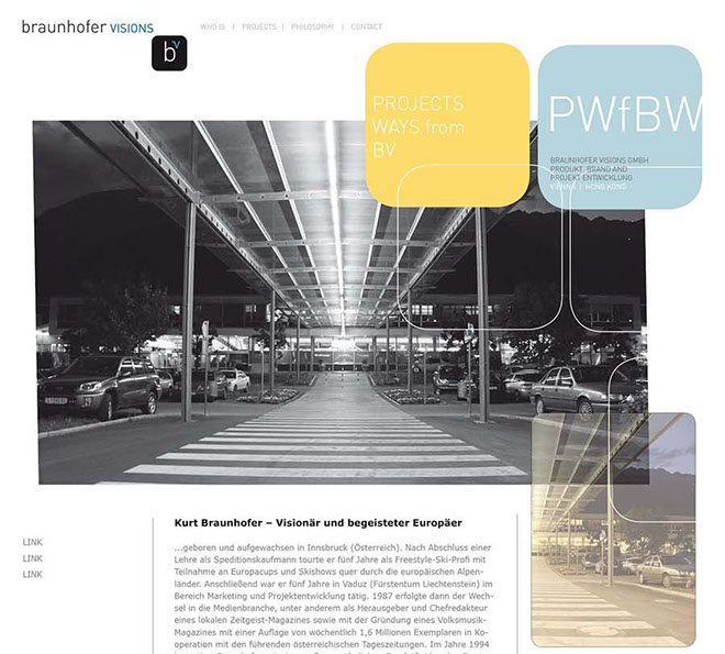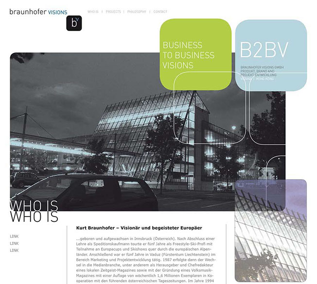 Braunhofer Visions - Kurt Braunhofer tourte fünf Jahre als Freestyle-Ski-Profi mit Teilnahme an Europacups und Skishows quer durch die europäischen Alpenländer. Anschließend war er fünf Jahre in Vaduz (Fürstentum Liechtenstein) im Bereich Marketing und Projektent-wicklung tätig. 1994 Entwicklung und Startschuss von PERSONAL SHOP, einem heute überdurchschnittlich erfolgreichen Versand-handels-Unternehmen. Seit 2005 mit Braunhofer Visions als Marketing-und Markenentwicklungs Agentur in Wien aktiv.