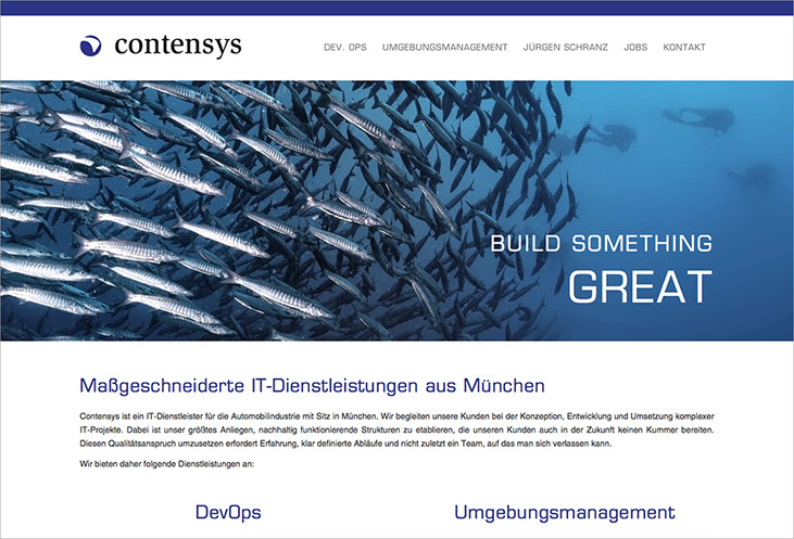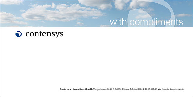 Contensys ist ein IT-Dienstleister für die Automobilindustrie mit Sitz in München. Contensys begleitet Kunden bei der Konzeption, Entwicklung und Umsetzung komplexer IT-Projekte. Ziel ist es nachhaltig funktionierende Strukturen zu etablieren, die auch in der Zukunft bestehen können. Diesen Qualitätsanspruch umzusetzen erfordert Erfahrung, klar definierte Abläufe und ein hochmotiviertes Team. Koch entwickelt das Corporate Design.
