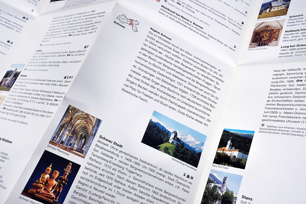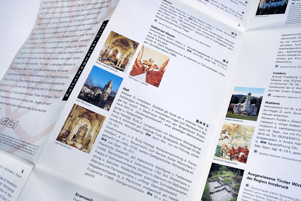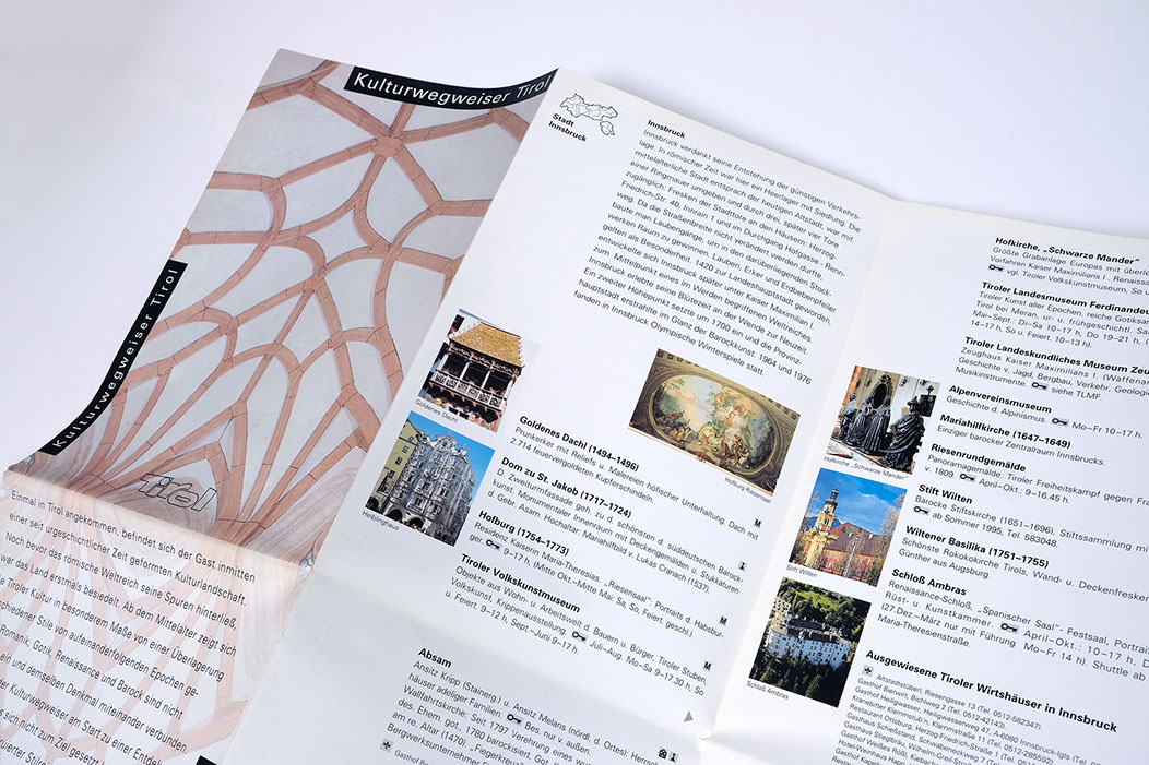 KULTURWEGWEISER TIROL.Einmal in Tirol angekommen, befindet sich der Gast inmitten einer seit urgeschichtlicher Zeit geformter Kulturlandschaft. Tirol lebt in ständiger Relation zu seinem kulturellen Erbe und in Zusammenhang mit seiner überwältigenden Natur. Der Kulturwegweiser führt sie sicher durch unser kulturelles Erbe.