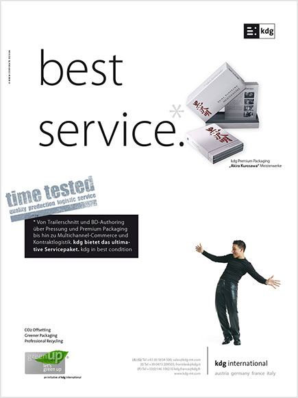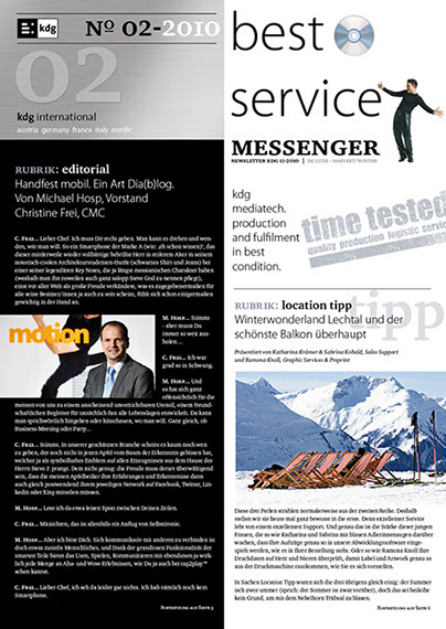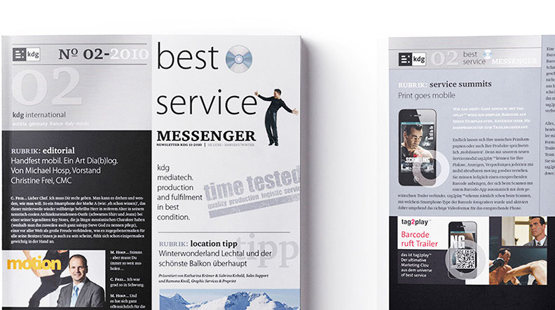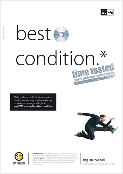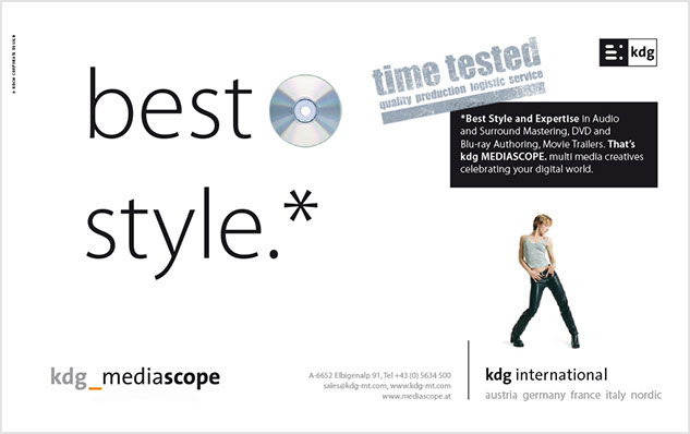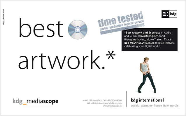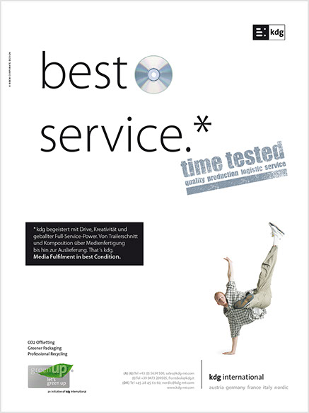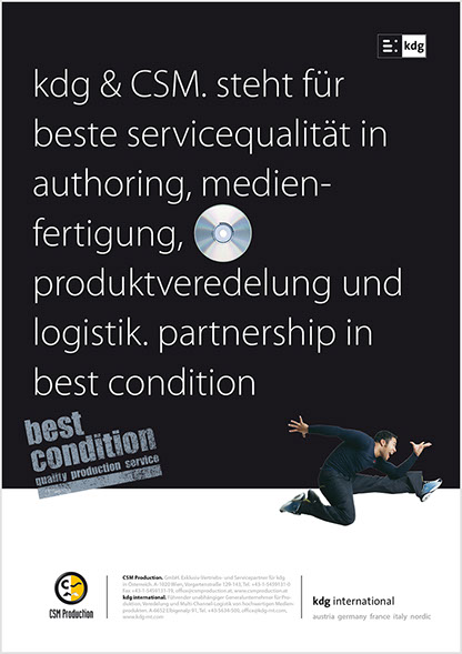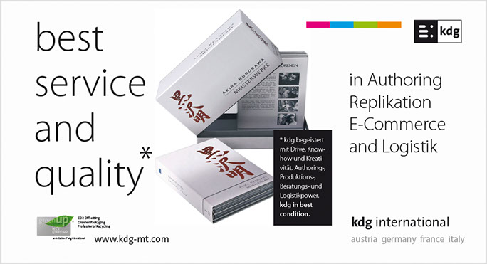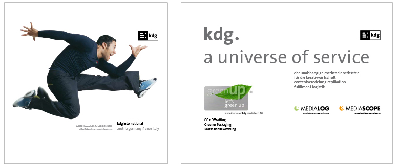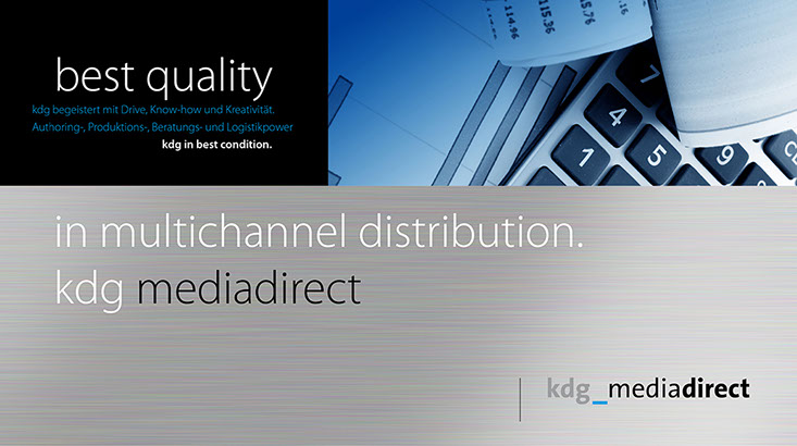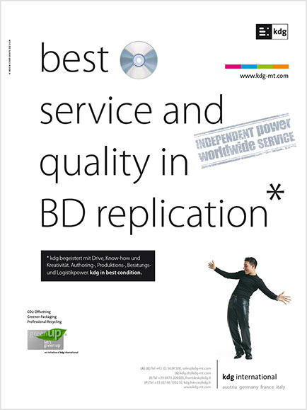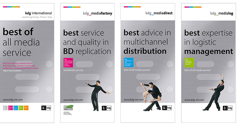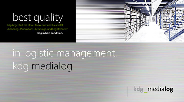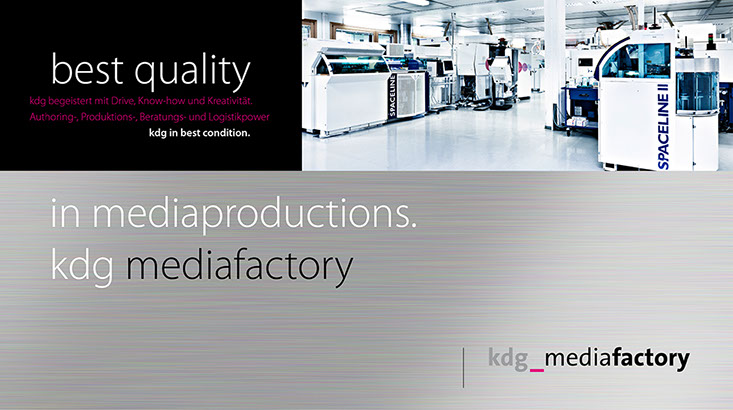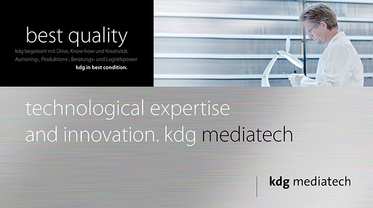 Von A wie Authoring bis Z wie Zustellung. the ultimate best of all media services. Das ist der Anspruch der kdg mediatech mit seinen Divisionen. Blu-ray-Authoring in den Studios der kdg mediascope, bei Verpackungsberatung und Abwicklung Ihrer Medienproduktion in der kdg mediafactory oder bei der Auslieferung der Produkte in der kdg medialog. Das Unternehmen kdg steht schon seit fast dreißig Jahren für Innovation, Drive und beste Service-Qualität in der Medienproduktion. Koch betreut die „kdg mediatech“ seit über 10 Jahren in Corporate Design, visueller Kommunikation, Campaining und Gesamtauftritt.