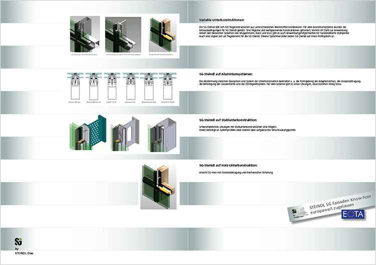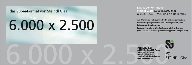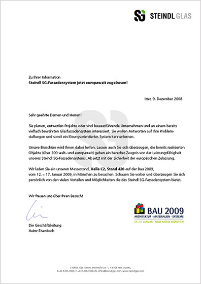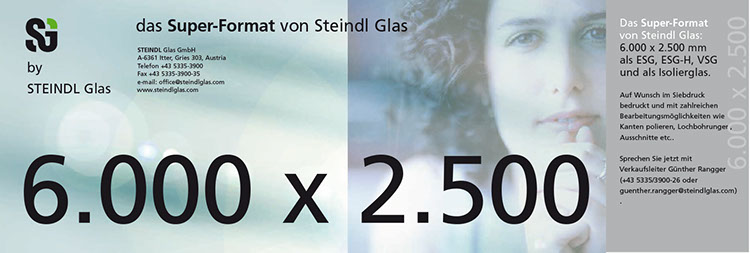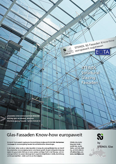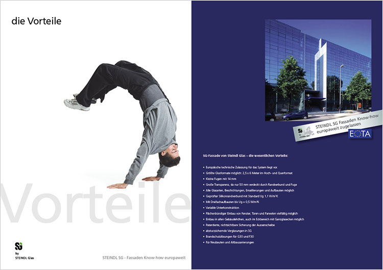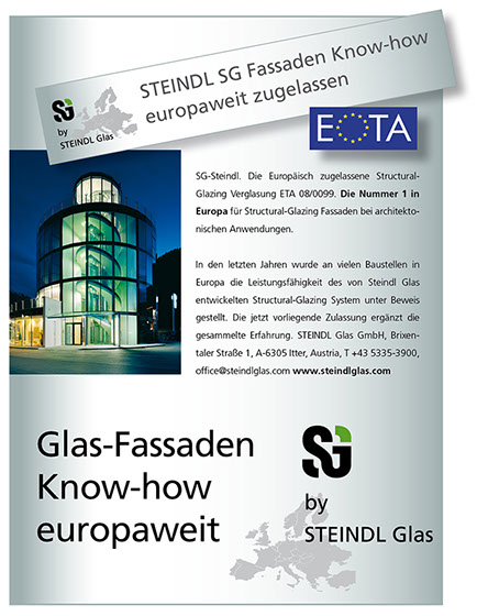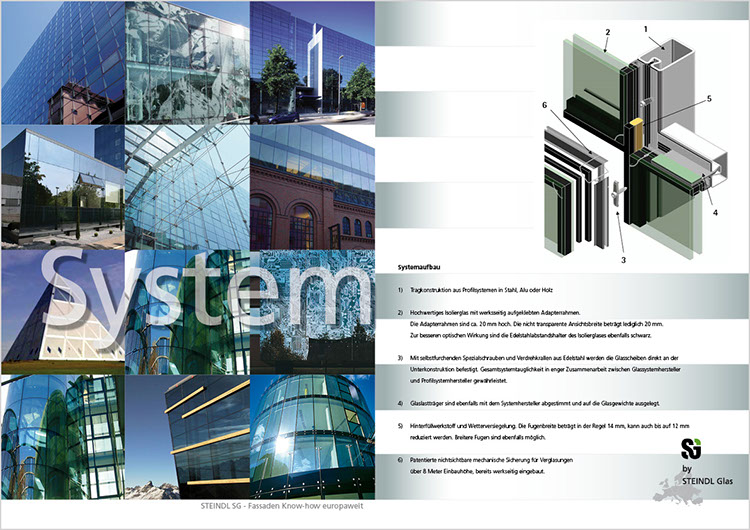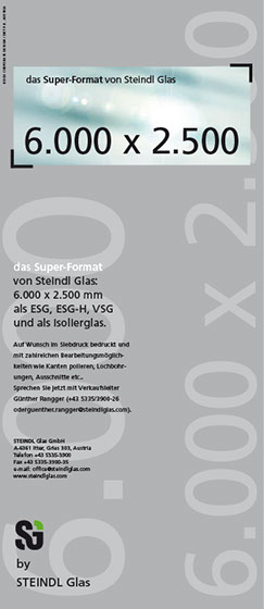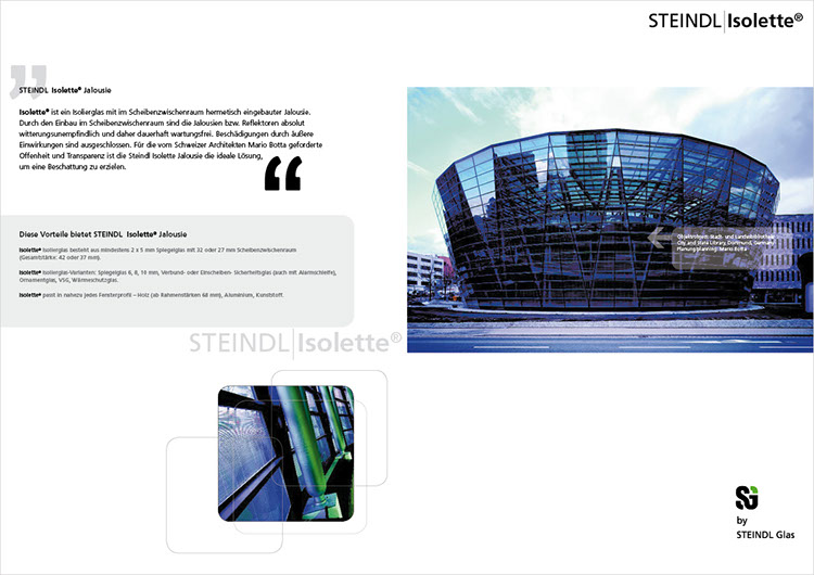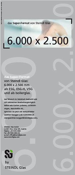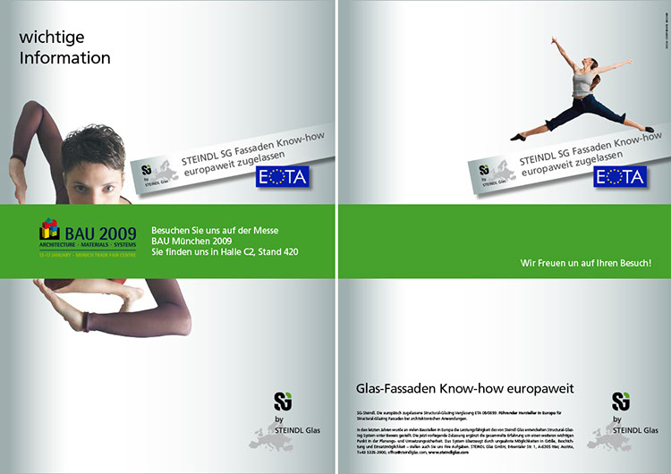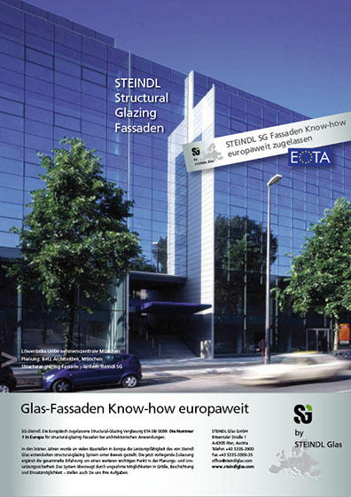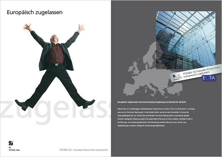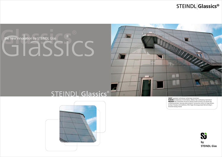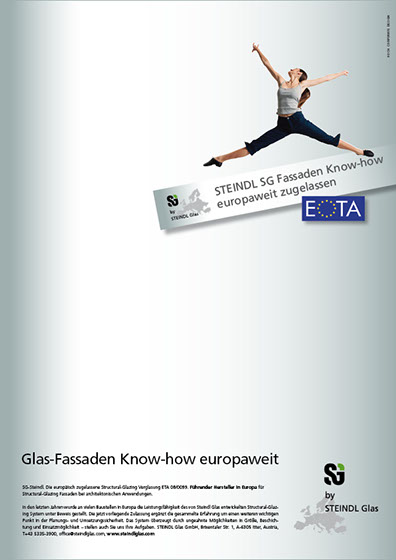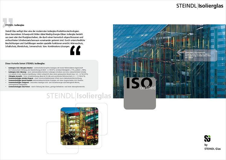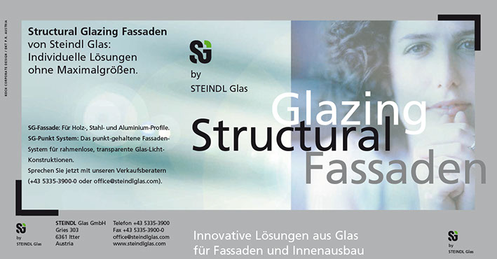 Koch entwickelt Corporate Design, Werbekampagnen und betreut über Jahre den Glashersteller Steindl Glas. CD, Werbekampagnen Messeauftritte, Hauszeitungen; Mailings; Produktkataloge. Steindl Glas ist einer der führenden Anbieter von Isolier-, Sicherheits- und Kunstglas sowie moderner Glasfassadensysteme. Höchste Innova-tionskraft, eine kontinuierliche Forschungs- und Entwicklungspolitik sowie der Einsatz modernster Technologien machen Steindl Glas zu einem im internationalen Wettbewerb erfolgreichen und hoch kompetitiven Unternehmen aus Österreich. Hauptabsatzmärkte sind neben Österreich vor allem Deutschland, Großbritannien, Italien und die Schweiz.