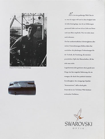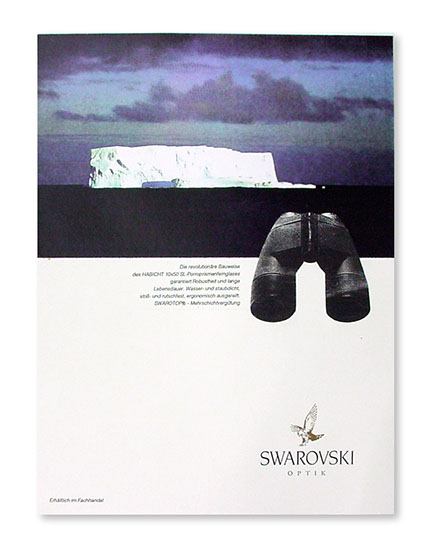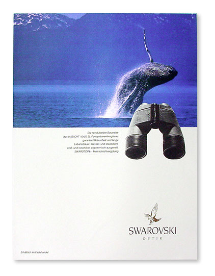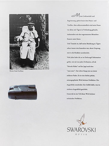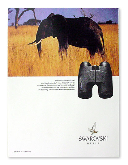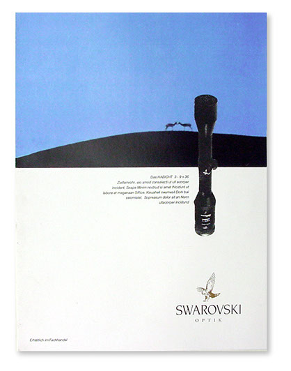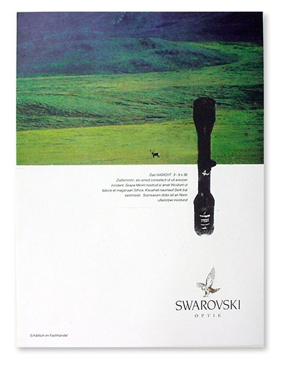 Die Grundlage der Kampagne ist das hochstehende Natur, Tier und Landschaftsbild in beispielhaft hoher bildnerischer Qualität. Unterstüizt durch Testimonial Sujets mit namhaften Persönlichkeiten. Hohe Qualität im Sehen des Gesehenen mit Optik in höchster technischer Qualität ist eine Symbiose. Die Leidenschaften für das erlebbar Mögliche werden sichtbar gemacht. Die gestalterische Reinheit vermittelt und verstärkt diese. Raum für mehr sehen und erleben mit einer Swarovski Optik.