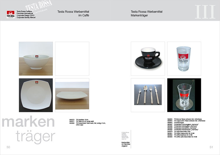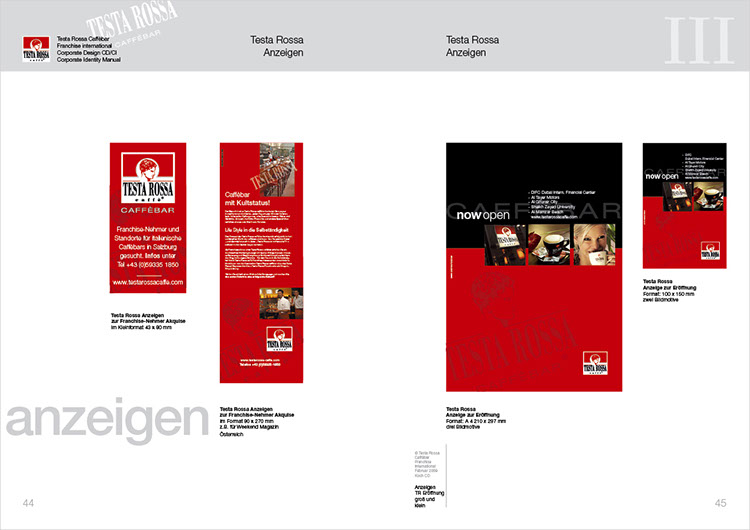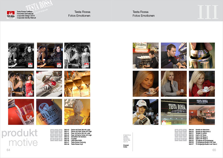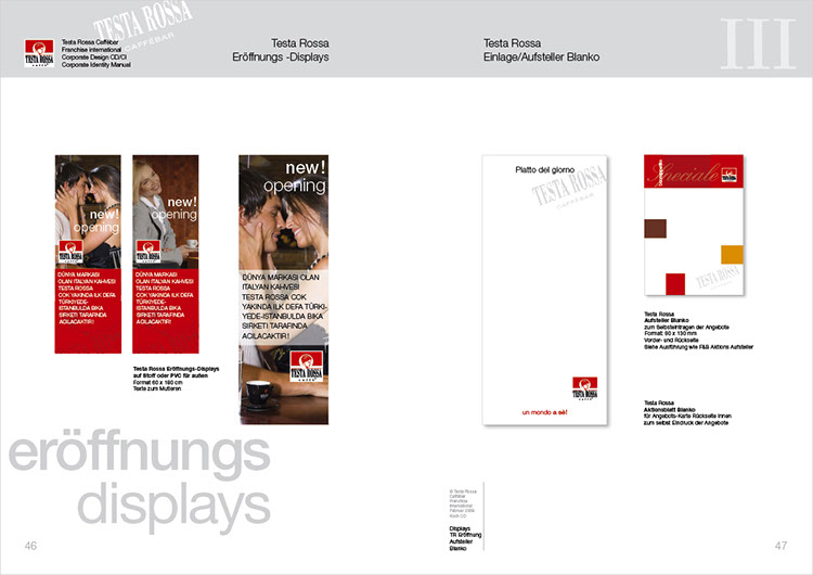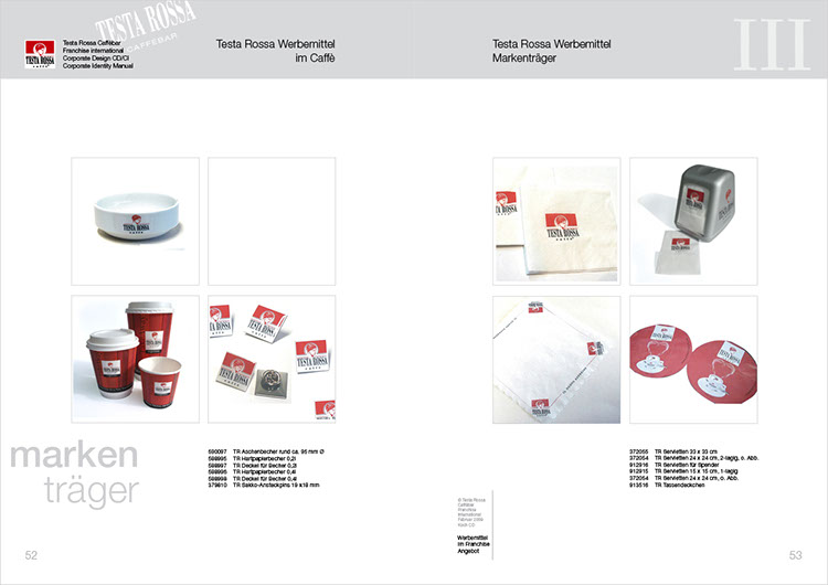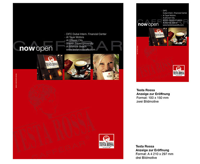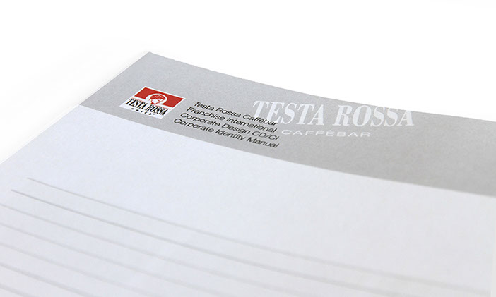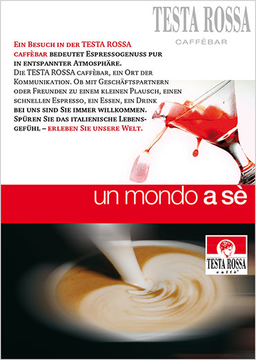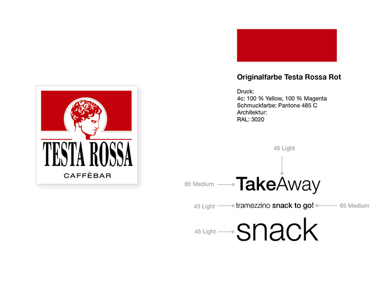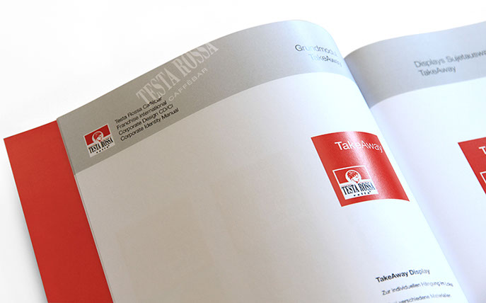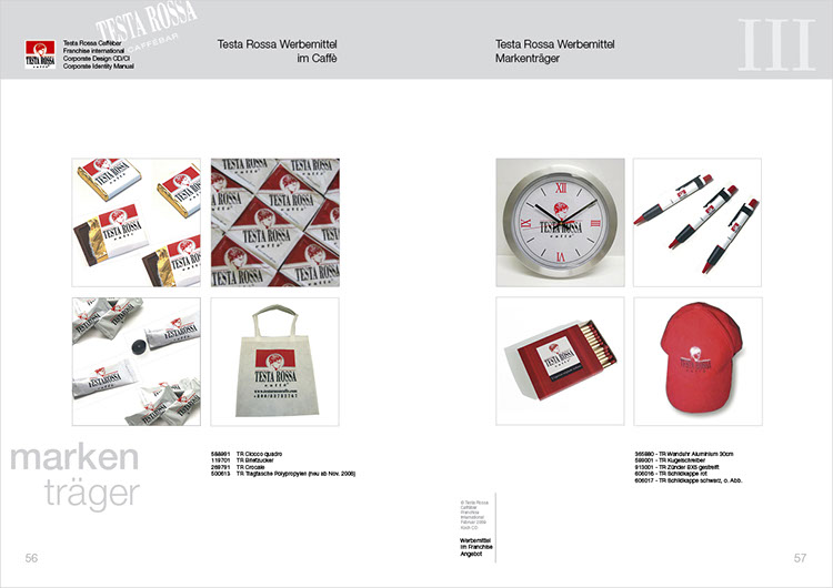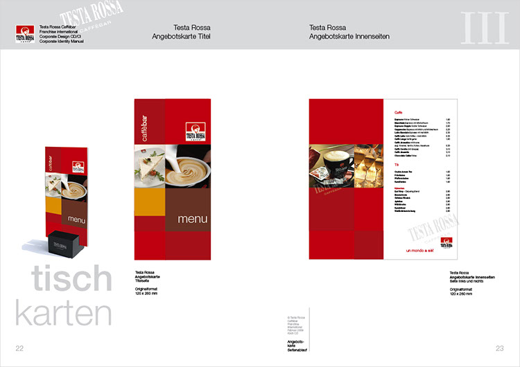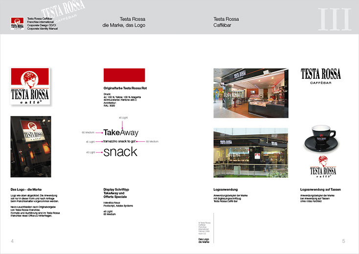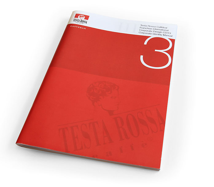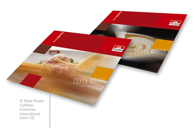 Corporate Design Manual für den gesamten Auftritt der Marke Testa Rossa Caffebar International. Ein konsistentes Auftreten der Marke bei allen Franchise Nehmern ist durch den zwingenden Einsatz einer CD Guideline gewährleistet. Koch CD entwickelte für Testa Rossa den gesamten Auftritt. CD, Anzeigen Kampagne, Marke im Außenbereich, Werbemittel, Gadgets. Auszug aus Teilen 1996 bis 2014. Testa Rossa Caffebars gibt es in Deutschland, Österreich, Ungarn, Türkei, Indien, Saudi Arabien, Ägypten.