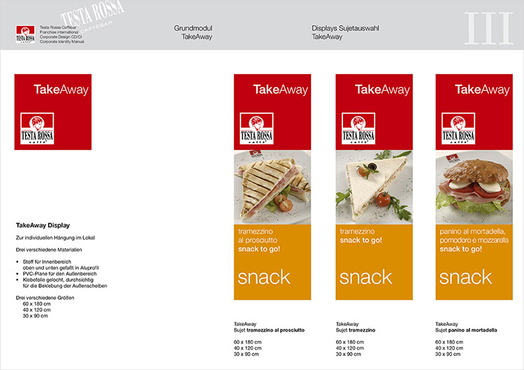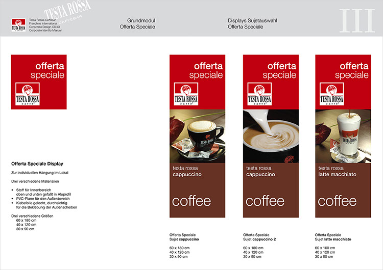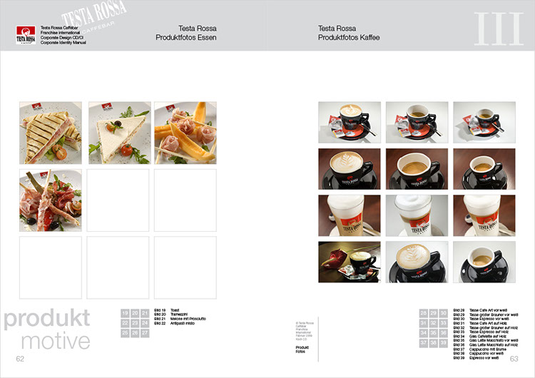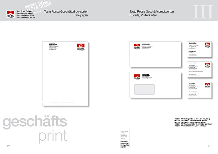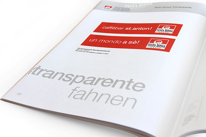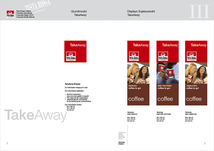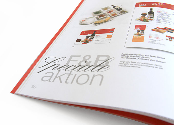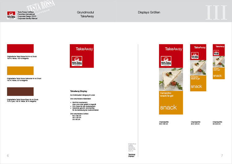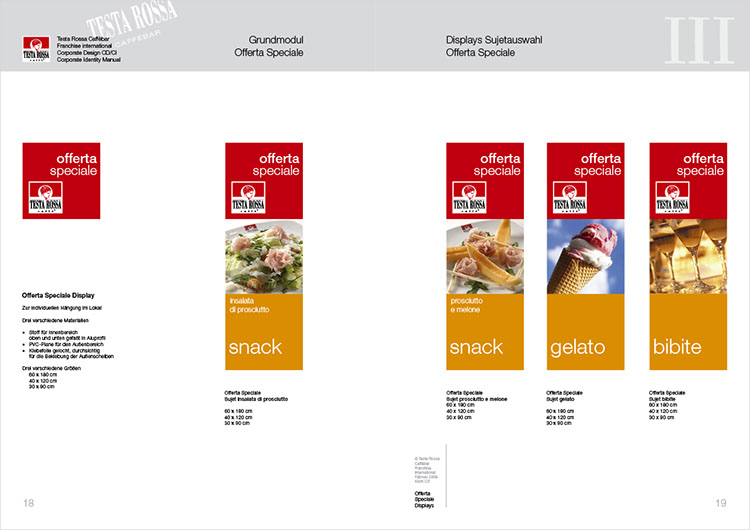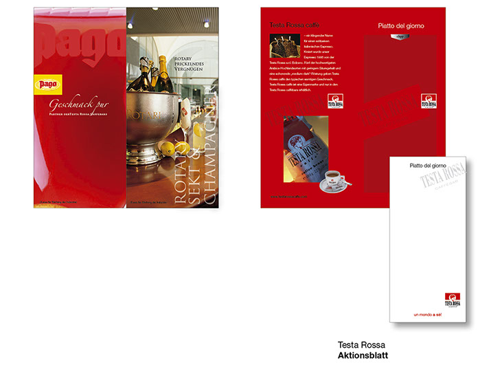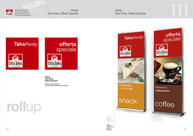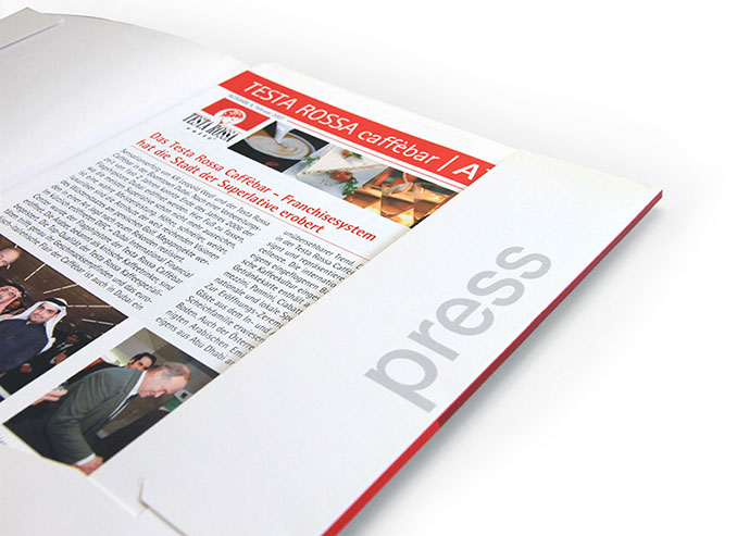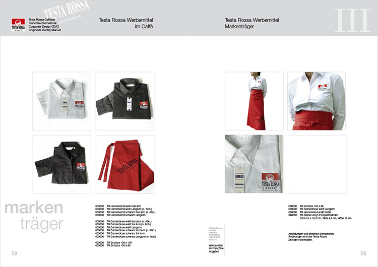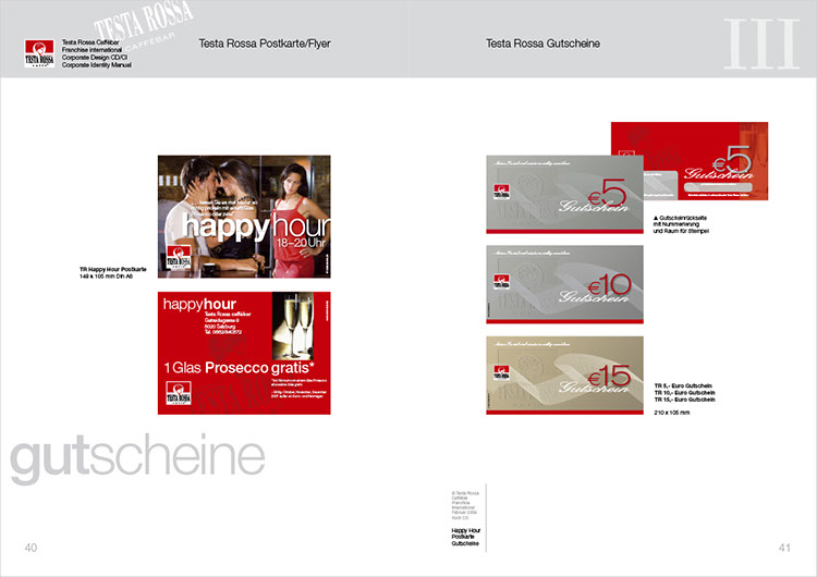 Corporate Design Manual für den gesamten Auftritt der Marke Testa Rossa Caffebar International. Ein konsistentes Auftreten der Marke bei allen Franchise Nehmern ist durch den zwingenden Einsatz einer CD Guideline gewährleistet. Koch CD entwickelte für Testa Rossa den gesamten Auftritt. CD, Anzeigen Kampagne, Marke im Außenbereich, Werbemittel, Gadgets. Auszug aus Teilen 1996 bis 2014. Testa Rossa Caffebars gibt es in Deutschland, Österreich, Ungarn, Türkei, Indien, Saudi Arabien, Ägypten.