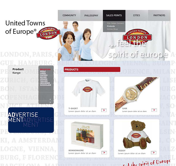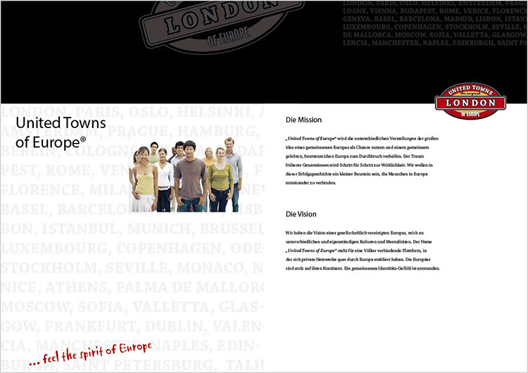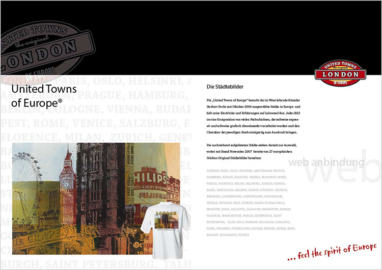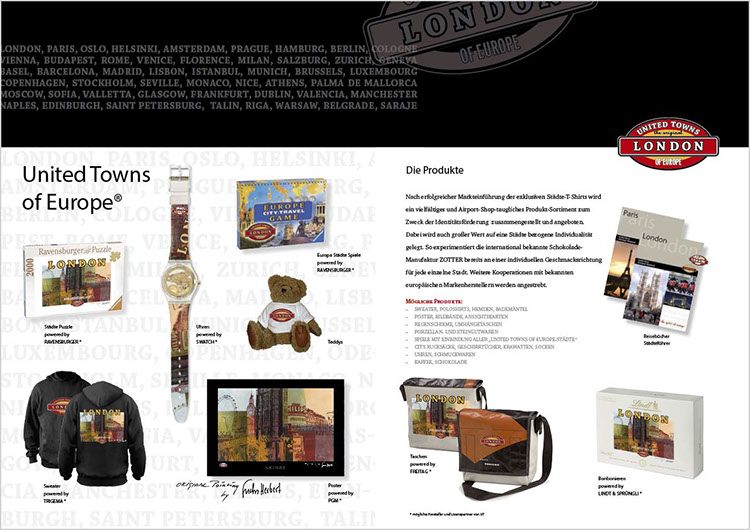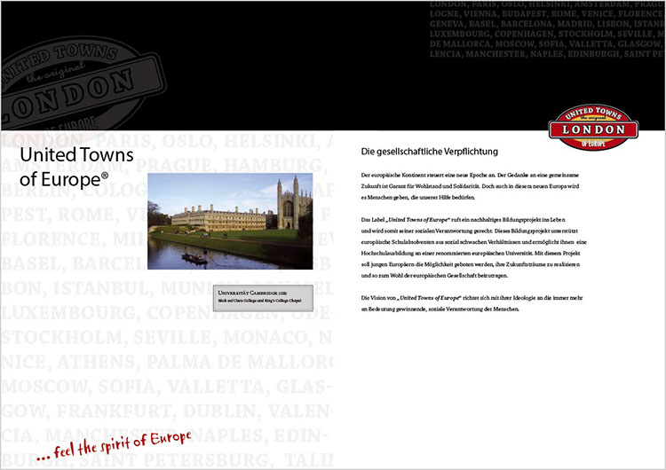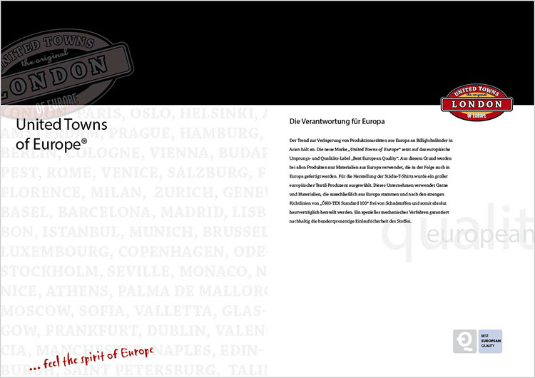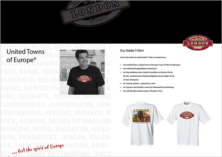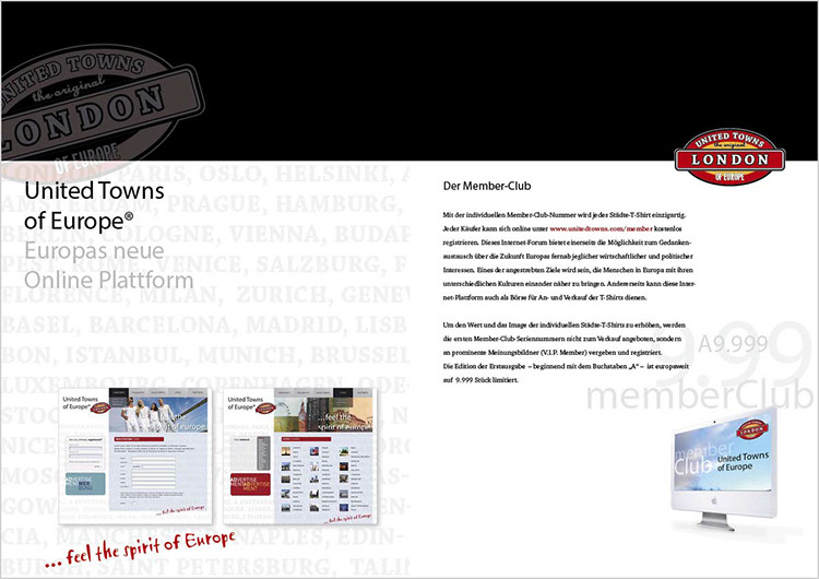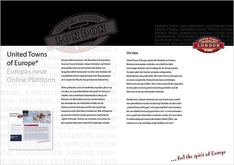 Europäer spielt das Internet mit seinen Möglichkeiten eine große Rolle. Diese Community soll die Integration der Europäer in einem gemeinsamen Europa fördern und die Menschen in Europa miteinander verbinden. Flankierend zu diesem Netzwerk werden hochwertige Produkte mit dem Label „United Towns of Europe“ in Europa eingeführt und vertrieben, die ausschließlich in Europa produziert und – so weit vorhanden – mit europäischen Materialien verarbeitet werden. Der Start dieser Produkte erfolgt mit einem individuellen Städte-T-Shirt, das exklusiv nur in der jeweiligen Stadt erhältlich sein wird. Koch CD entwickelt den gesamten visuellen Auftritt.