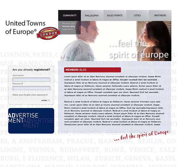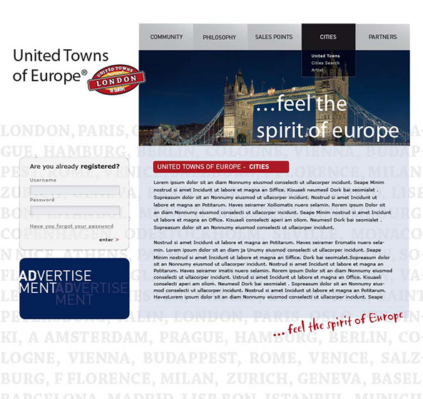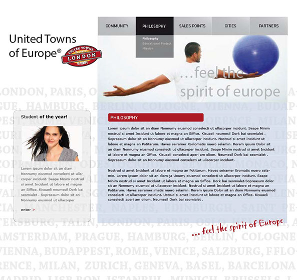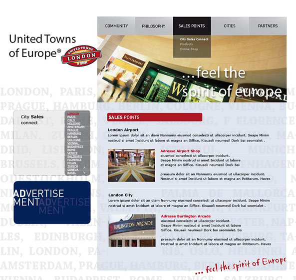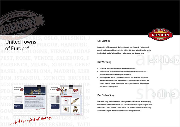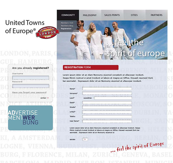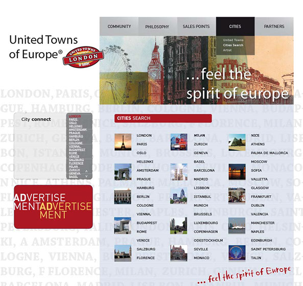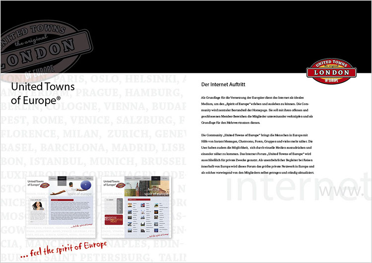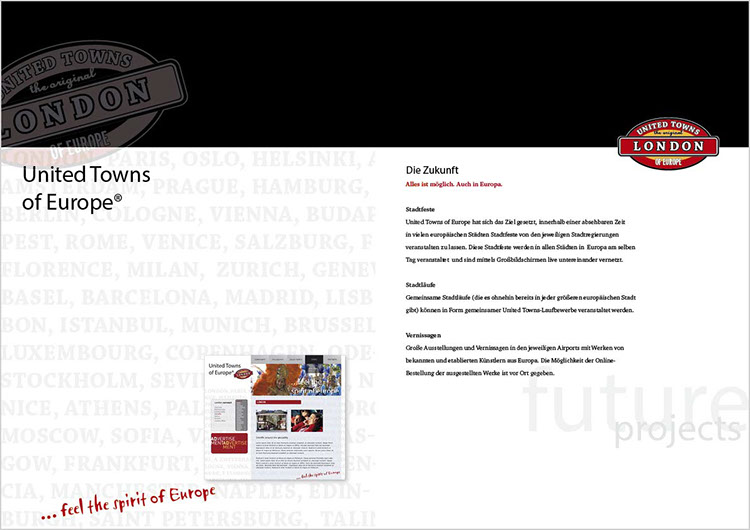 Europäer spielt das Internet mit seinen Möglichkeiten eine große Rolle. Diese Community soll die Integration der Europäer in einem gemeinsamen Europa fördern und die Menschen in Europa miteinander verbinden. Flankierend zu diesem Netzwerk werden hochwertige Produkte mit dem Label „United Towns of Europe“ in Europa eingeführt und vertrieben, die ausschließlich in Europa produziert und – so weit vorhanden – mit europäischen Materialien verarbeitet werden. Der Start dieser Produkte erfolgt mit einem individuellen Städte-T-Shirt, das exklusiv nur in der jeweiligen Stadt erhältlich sein wird. Koch CD entwickelt den gesamten visuellen Auftritt.